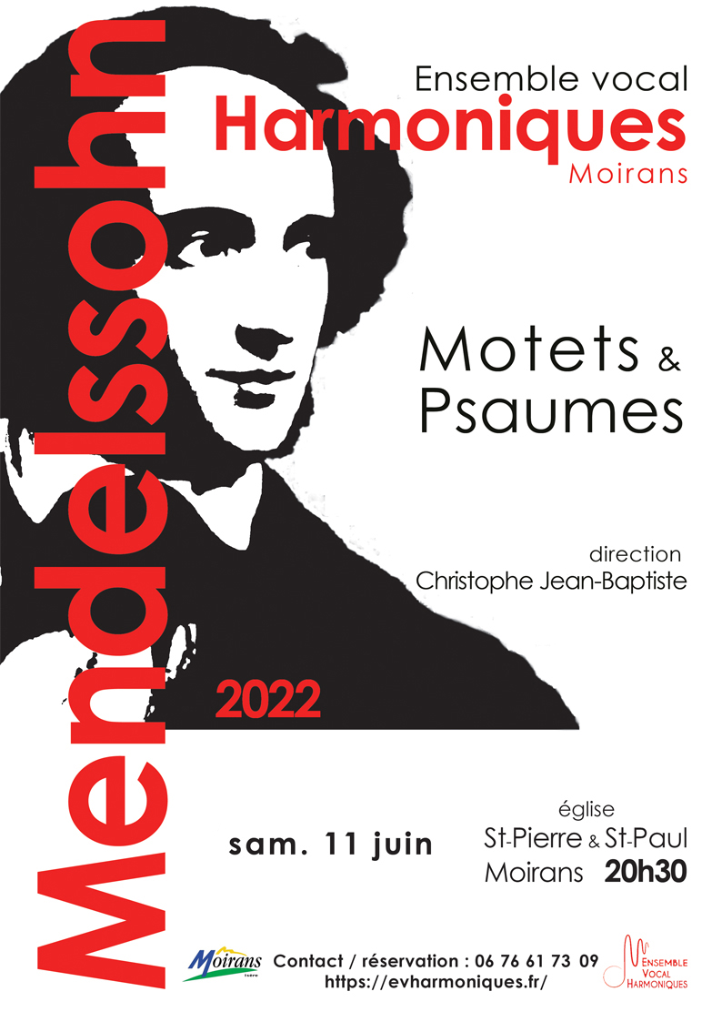 Après deux années de jachère forcée, l’Ensemble Vocal Harmoniques est heureux de renouer avec le public avec un programme a capella consacré à Mendelssohn. Il comportera principalement des œuvres sacrées, dont ses grands motets et psaumes, où l’on retrouve sa profonde admiration pour Jean-Sébastien Bach, ainsi que de petites pièces aux harmonies très inspirées composées pour le chœur de la cathédrale de Berlin. Il sera complété par quelques pièces profanes de Mendelssohn et de Schumann auquel le liait une solide amitié.